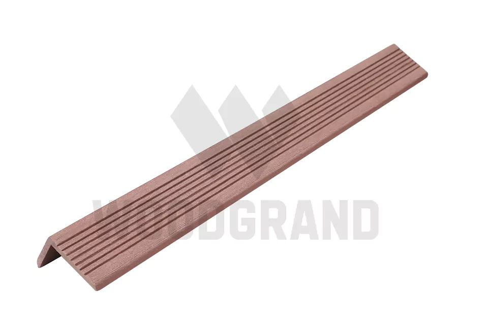 Монтаж уголка из ДПК производится с использованием саморезов, которые крепятся непосредственно к террасной доске или ступени. С помощью этого уголка вы сможете закрыть пространство между стеной и настилом, а также обработать торец террасной доски.